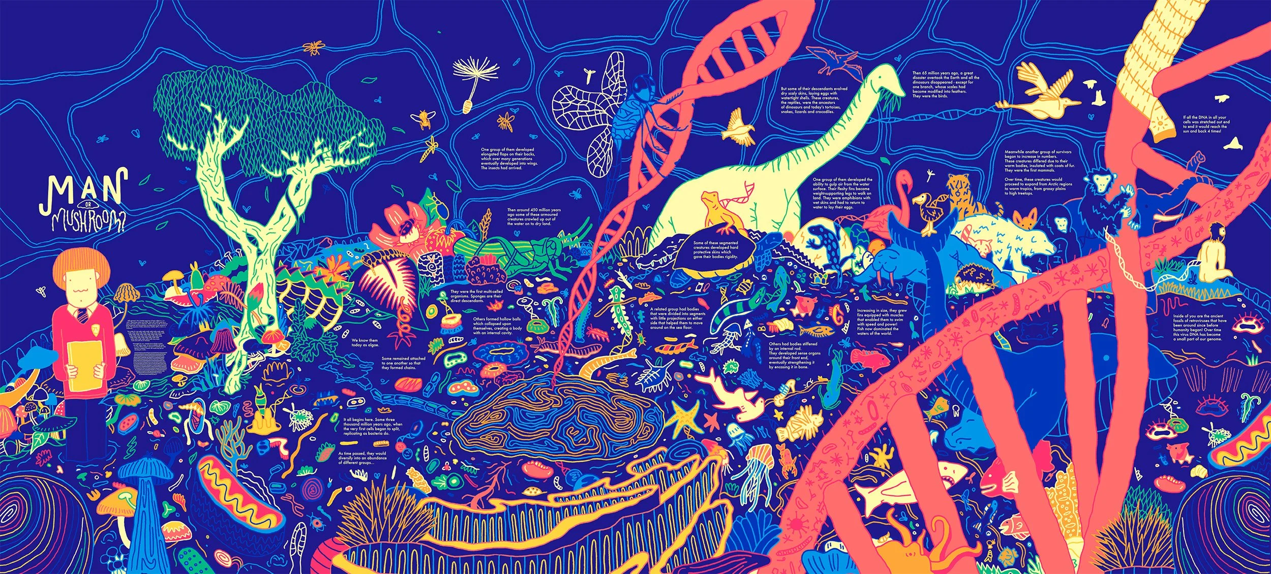 My interpretation centres on the interior of a cell, illustrating the diversity of life and the connectivity of organisms through this essential building block. The resulting mural is a genetic soup of species and organisms brought together by a vibrant colour palette.